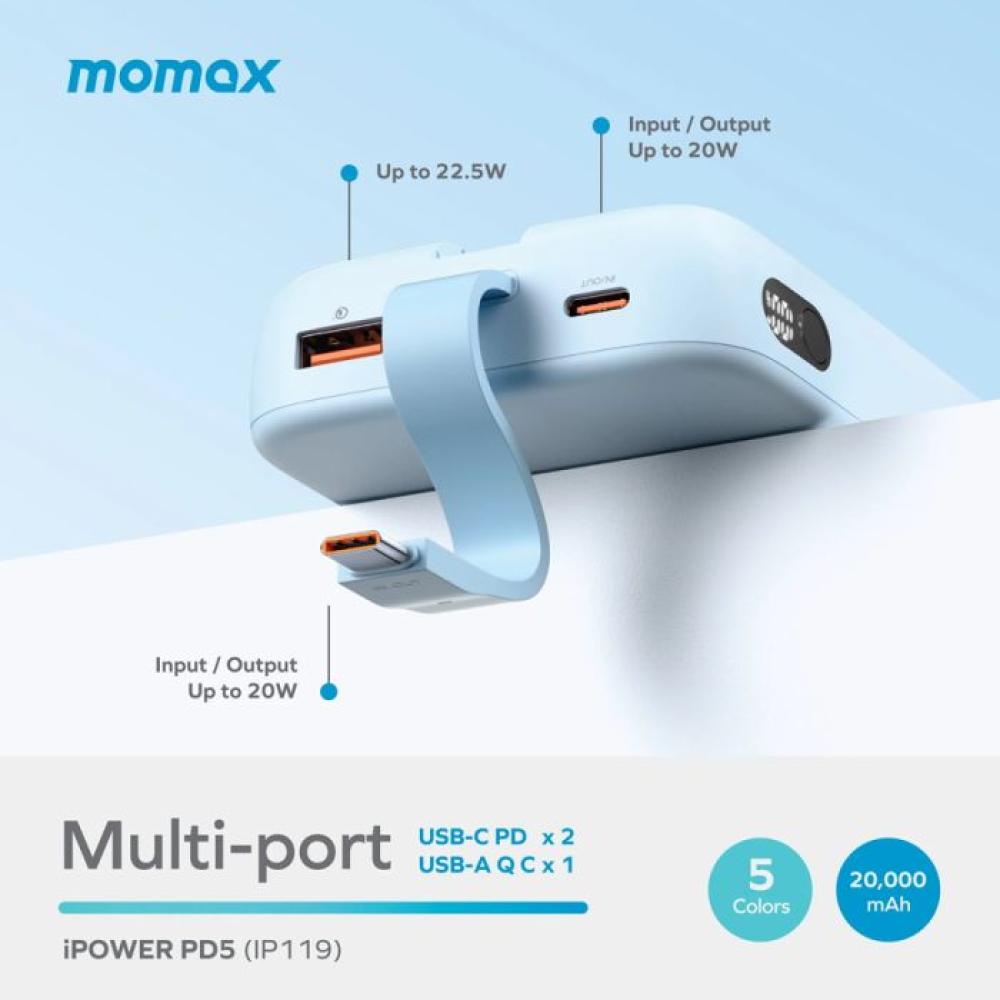 - منافذ متعددة: يمكن لمنافذ USB-C وUSB-A بالإضافة إلى كابل الشحن USB-C المدمج شحن ثلاثة أجهزة في نفس الوقت، وهو أمر فعال وموفر للوقت